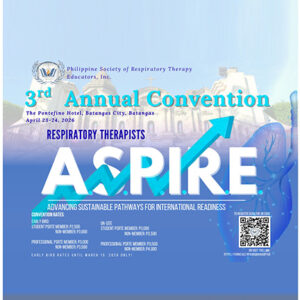 APRIL 23-24, 2026 – Join the Philippine Society of Respiratory Therapy Educators (PSRTE) for its 3rd Annual Convention on April 23–24, 2026 at PonteFino Hotel, Batangas City. With the theme “Advancing Sustainable Pathways for International Readiness,” this convention offers meaningful learning, collaboration, and insights for respiratory therapy educators. All PSRTE members are enjoined to participate. See you there!