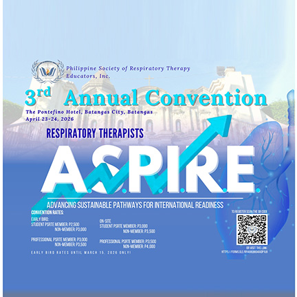 Join the Philippine Society of Respiratory Therapy Educators (PSRTE) for its 3rd Annual Convention on April 23–24, 2026 at PonteFino Hotel, Batangas City. With the theme “Advancing Sustainable Pathways for International Readiness,” this convention offers meaningful learning, collaboration, and insights for respiratory therapy educators. All PSRTE members are enjoined to participate.